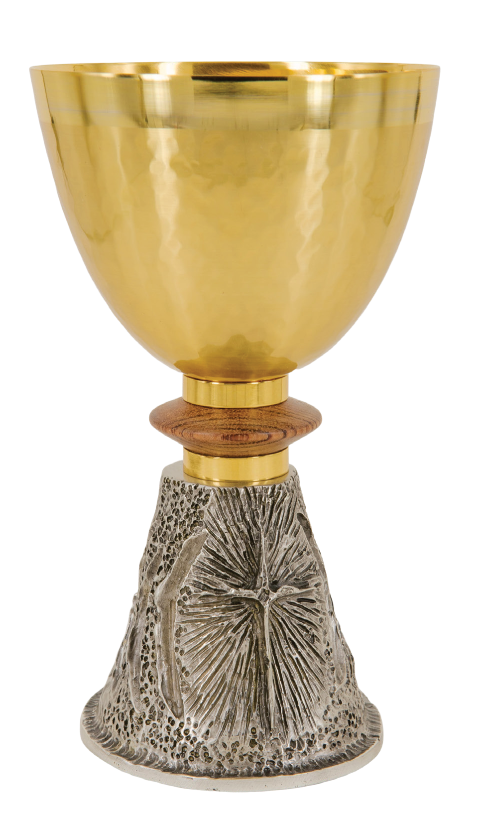 Kelk met op de voet 'omstraald kruis' in verloren was techniekCuppa in alpaca-metaalKnoop in houtH. 17 cmDiam. 10 cm