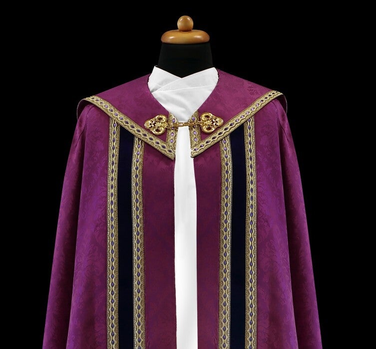 Koormantel in een lichte damaststof met eenvoudige decoratie met fluwelen band omzoomd met gouden sierband.